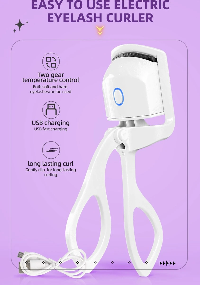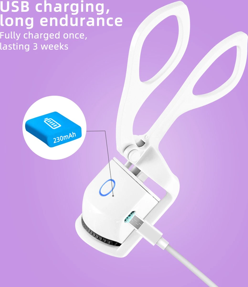 Deze elektrische wimperkruller is ontworpen om uw wimpers snel en eenvoudig te krullen met behulp van warmte. Het apparaat is gemakkelijk te gebruiken en heeft een ergonomische greep voor extra comfort. De wimperkruller heeft 2 modes ( 85°/65°), de 85° stand is ontworpen voor harde en dikke wimpers 65° is geschikt voor zachte en dunne wimpers, waardoor u de perfecte krul kunt creëren voor elke gelegenheid. Het is zacht, zodat het uw wimpers niet beschadigt en u geen pijn zult voelen tijdens het gebruik. De wimperkruller is ook veilig in gebruik dankzij de warmtebeveiliging. door de warmte zullen uw krullen veel langer gekruld zijn dan een normale krultang. Bovendien is deze wimperkruller oplaadbaar met de meegeleverde Type C-kabel.