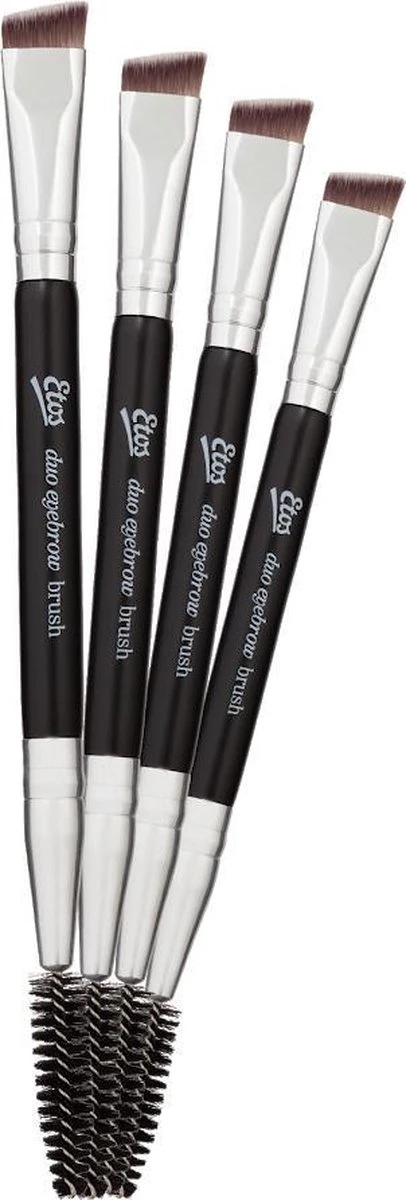 Etos Eyebrow Brush Duo is door het korte en schuin afgesneden haar erg geschikt voor het aanbrengen van wenkbrauwpoeders en crèmes.